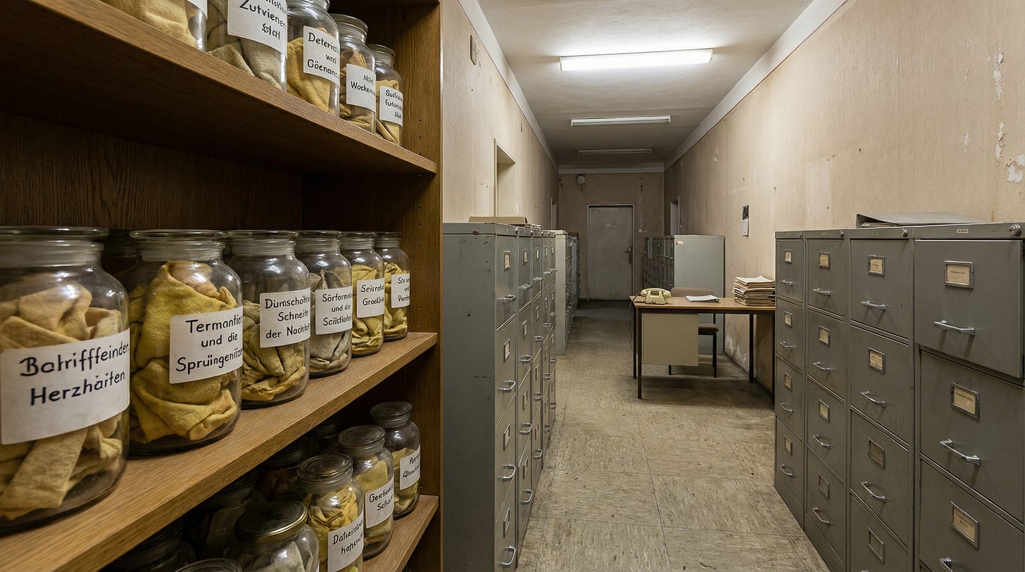 This is what comprehensive surveillance looks like when implemented with German efficiency. Something quieter than the camps, pedestrian in its horror: the reduction of human interiority to administrative data. Your secrets, your affairs, your complaints muttered over dinner, your doubts about the regime whispered to a friend. All of it documented, cross-referenced, filed. Leverage, organized alphabetically.